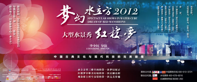 “夢幻水立方”之大型水上秀《紅樓夢》計劃于2012年6月22日至8月2日期間共演出30場,每周除周一、周二休息外共演出5場,每場的演出時長約在60至70分鐘之間。演出以賈寶玉和林黛玉的經(jīng)典愛情故事為主線,以千古巨著、四大名著之首的《紅樓夢》中的經(jīng)典場景及事件做串聯(lián),以最奇絕瑰麗、時尚超前的特效、特技、聲畫、舞美、歌舞等先進技術(shù)和表演方式為呈現(xiàn)手段,更結(jié)合如夢似幻的北京新地標(biāo)水立方內(nèi)的一景一物、點點滴滴,令觀眾猶如置身“假作真時真亦假”的4D版天上人間、大觀園中,與聲勢浩大的一流演員陣容共同演繹、共同沉醉,共做華夏五千年來最凄美不凡、震人心魄、催人淚下、發(fā)人深醒的一出《紅樓夢》。