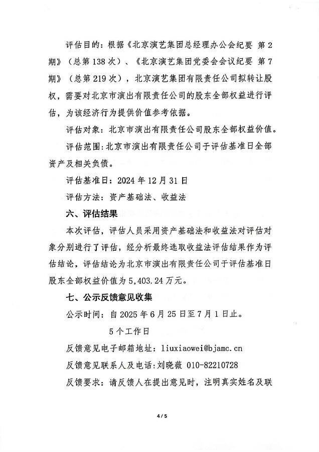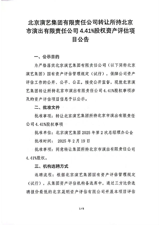 北京演藝集團有限責任公司轉讓所持北京市演出有限責任公司4.41%股權資產評估項目公告