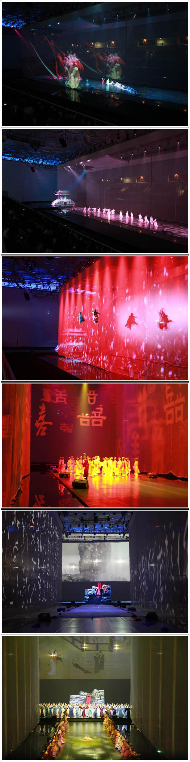 在水立方搭建水上舞臺,綜合舞蹈、音樂、特效、視頻等演出形態(tài),以當(dāng)下最新奇瑰麗的手段,百余人的演員陣容呈現(xiàn)出中國五千年最美的一個夢——《紅樓夢》,讓觀眾領(lǐng)略如詩如畫,美輪美奐的紅樓世界。選取《紅樓夢》中最為精髓,最為經(jīng)典的情節(jié)內(nèi)容,傳遞出亙古不變的色彩和芬芳。通過水立方的超大視覺舞臺全面展現(xiàn):女媧補天的雄奇,寶玉降生的靈動,大觀園內(nèi)的旖旎春色,太虛幻境的離奇春夢,寶黛共讀西廂的甜美,黛玉葬花的凄美,元妃省親的尊榮,寶玉成親的盛大與荒誕,黛玉之死的悲愴,重游瀟湘館的蒼涼……觀眾將與紅樓夢中人一般,同笑同哭,同歌同嘆。